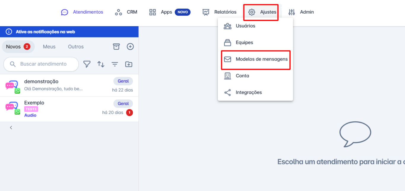 Na tela inicial da plataforma, clique em "Ajustes". No menu que se abrir, clique em "Modelos de Mensagem".
