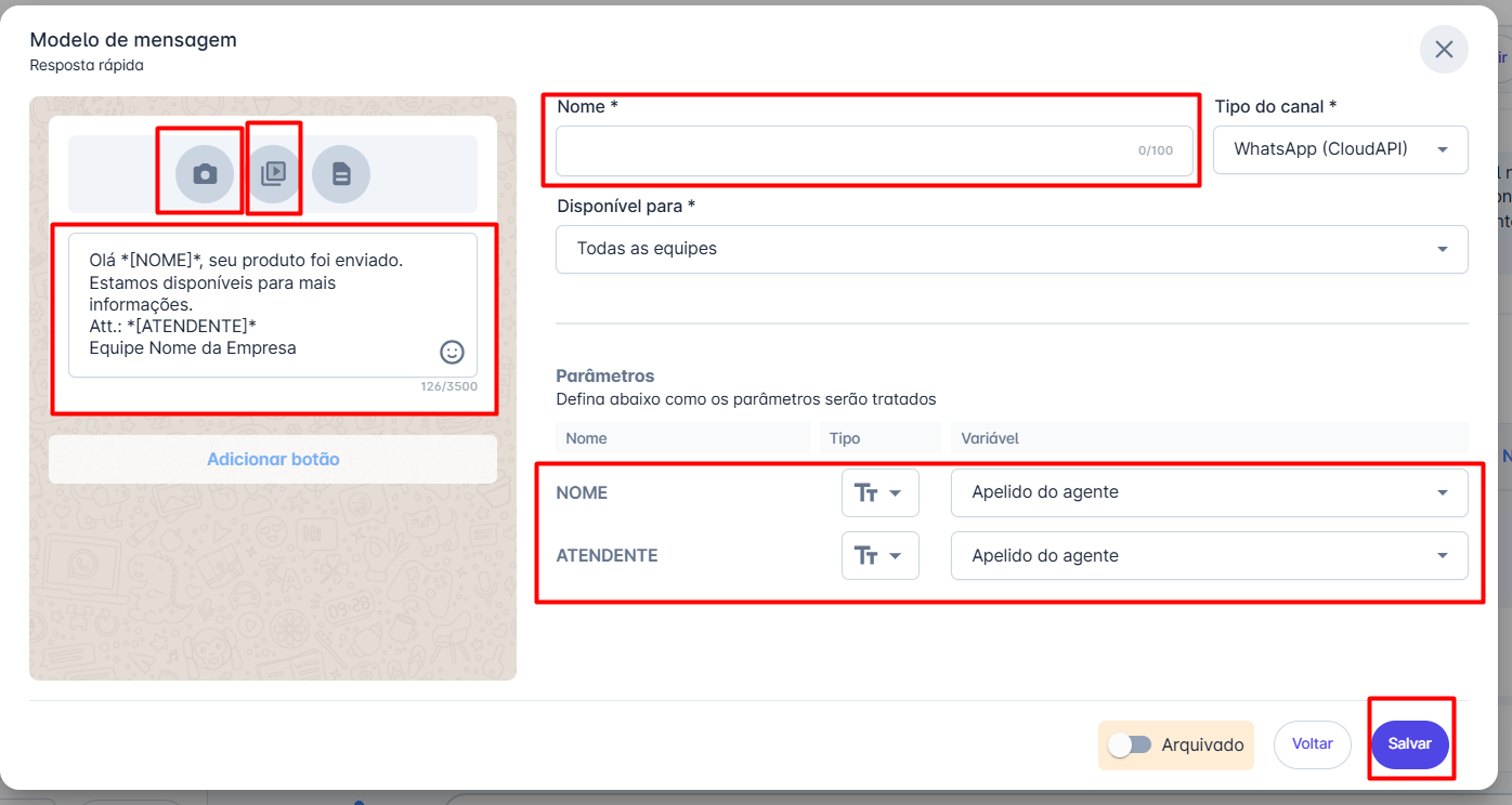 Além do texto, você pode incluir imagens, vídeos, documentos e botões para tornar a mensagem mais interativa.