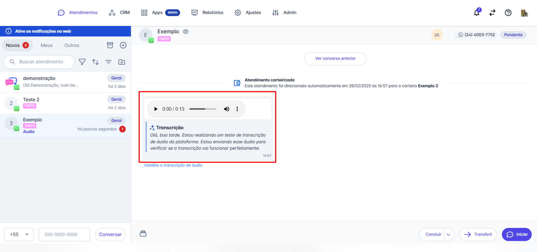 Após a ativação, sempre que uma mensagem de áudio for recebida, ela será transcrita automaticamente. A transcrição ficará visível na conversa, facilitando o atendimento e o registro das informações compartilhadas pelo contato.