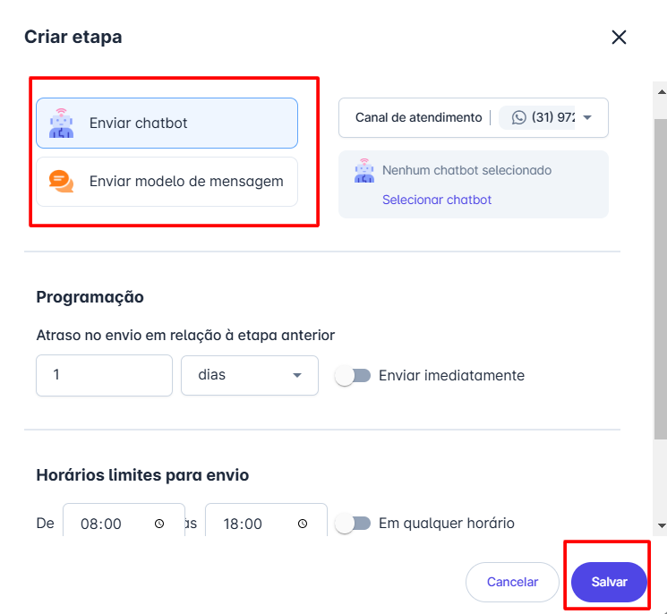 Ação da Etapa: Escolha a ação que será realizada nesta etapa (envio de mensagem, ação no chatbot, etc.).