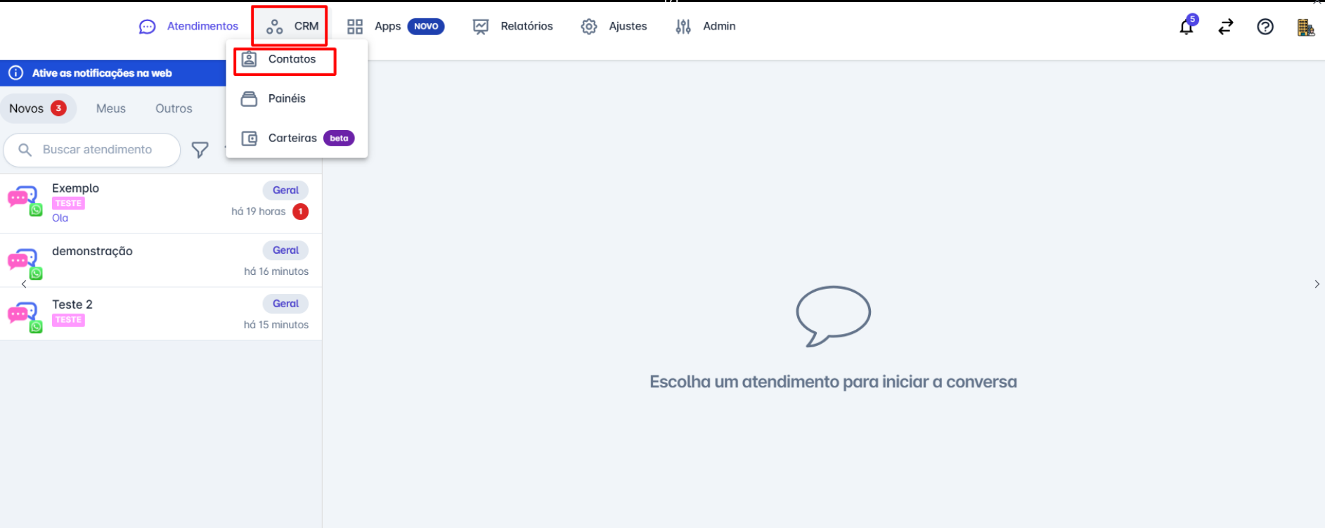Passo 1: Na tela inicial, clique no menu CRM em seguida clique na opção Contatos