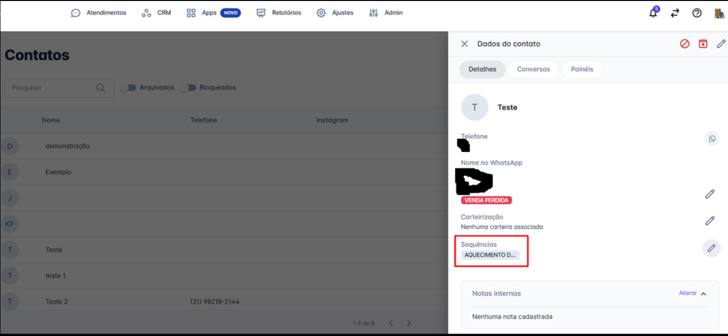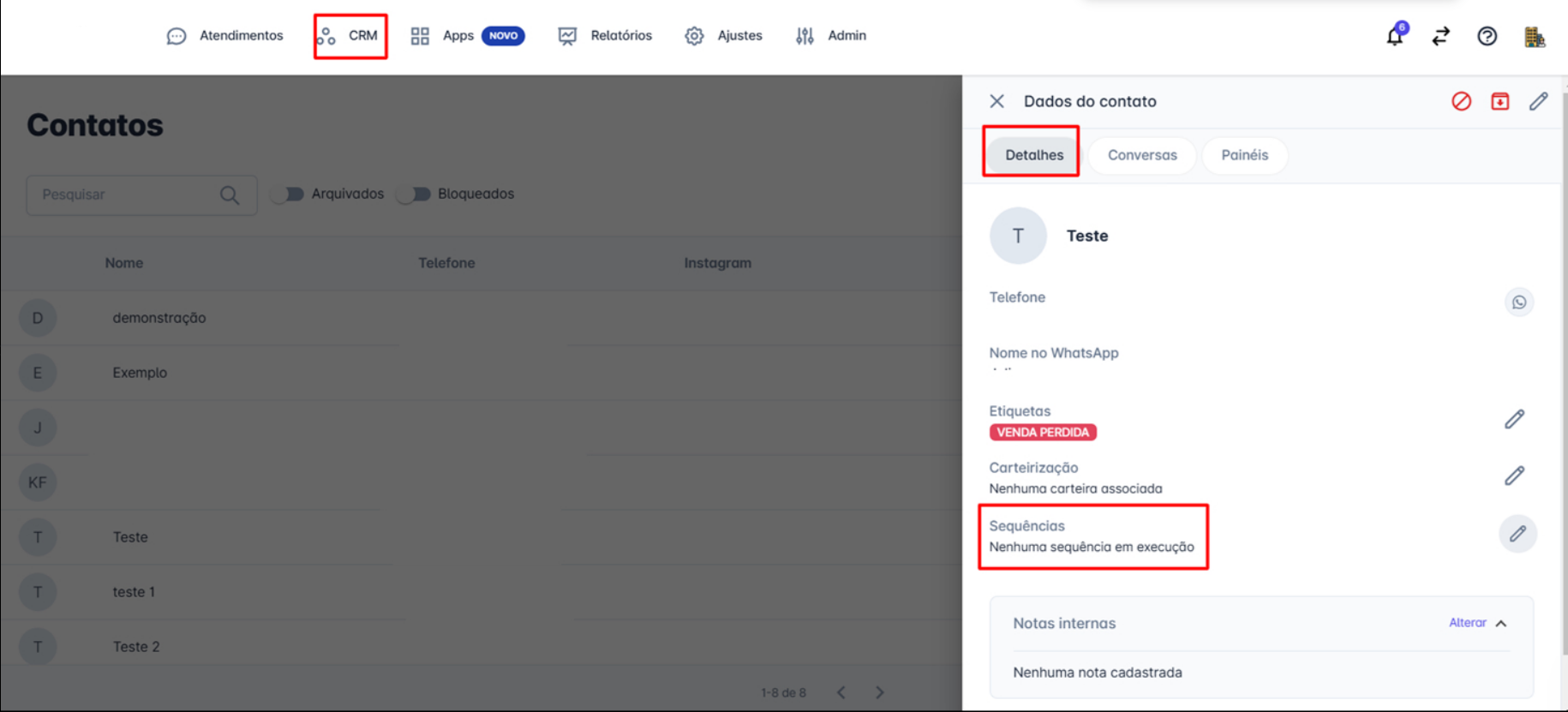 A inclusão e exclusão de contatos em uma sequência também pode ser feita diretamente nos detalhes do contato. Inclusive durante um atendimento.