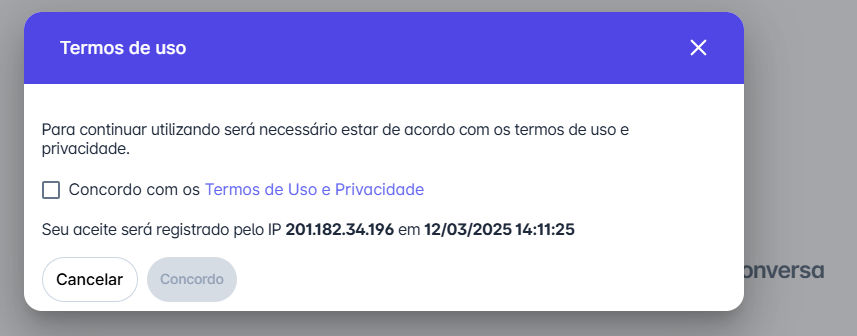 Caso seja seu primeiro acesso, após executar os passos acima será necessário aceitar os Termos de Uso e Privacidade. Basta clicar na caixa de seleção e, em seguida, clicar em concordo.