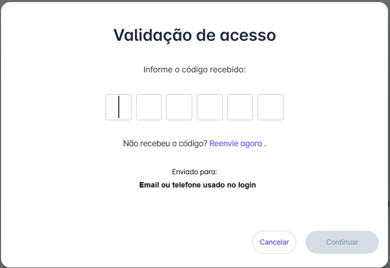 Você receberá um novo código de 6 dígitos para o mesmo canal de comunicação que utilizou para fazer o login. Insira o código e clique em continuar.