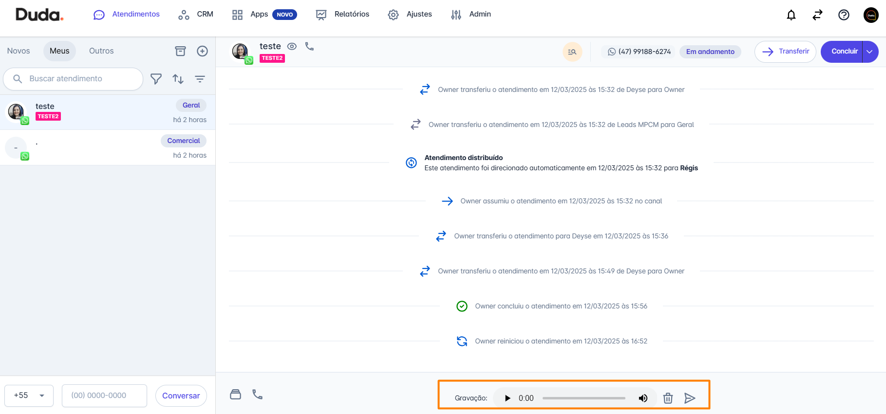 Se você sair do atendimento antes de concluir o envio do áudio, a mensagem será perdida e será necessário gravá-la novamente.