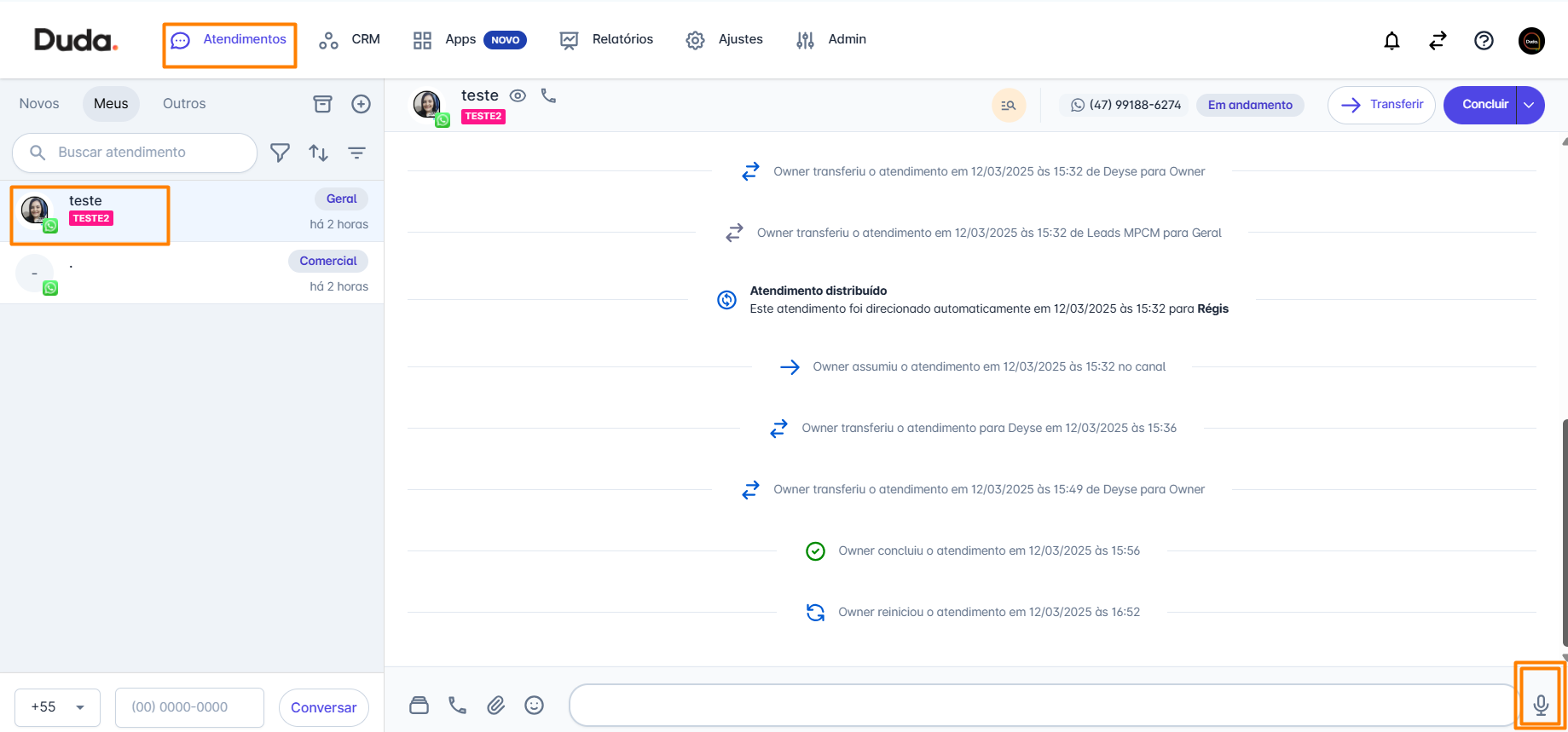 Passo 1: Na tela inicial, acesse o menu 'Atendimentos'. Selecione o contato para o qual deseja enviar um áudio, para que a janela de conversa seja aberta.