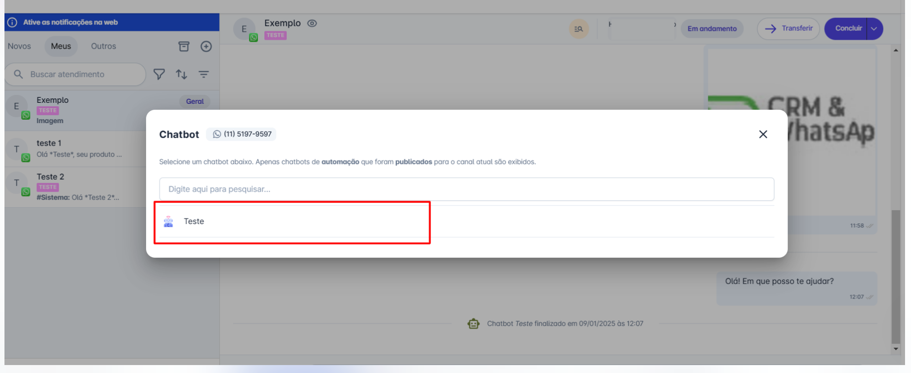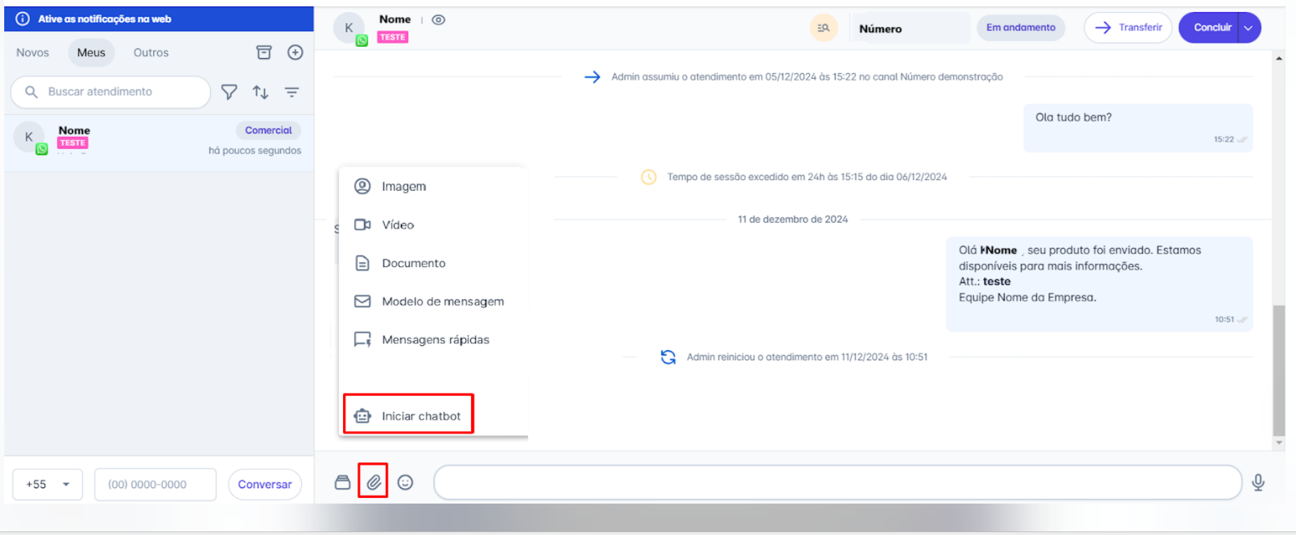 Passo 1: Na tela inicial, acesse o menu "Atendimentos". Selecione o contato para o qual deseja iniciar um chatbot, para abrir a janela de conversa. Em seguida, clique no ícone