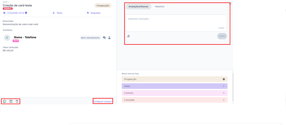 Passo 3: Após todo o preenchimento, o Card ficará da seguinte maneira. É possível, após a criação, inserir mais informações na lateral direita, incluindo a opção de anexar arquivos. No canto inferior direito, estão demonstradas as fases que este painel possui. No canto inferior esquerdo, são exibidos alguns ícones que permitem: Duplicar, Arquivar e Excluir o card, respectivamente. E logo ao lado dos ícones, existe a opção de configurar campos.