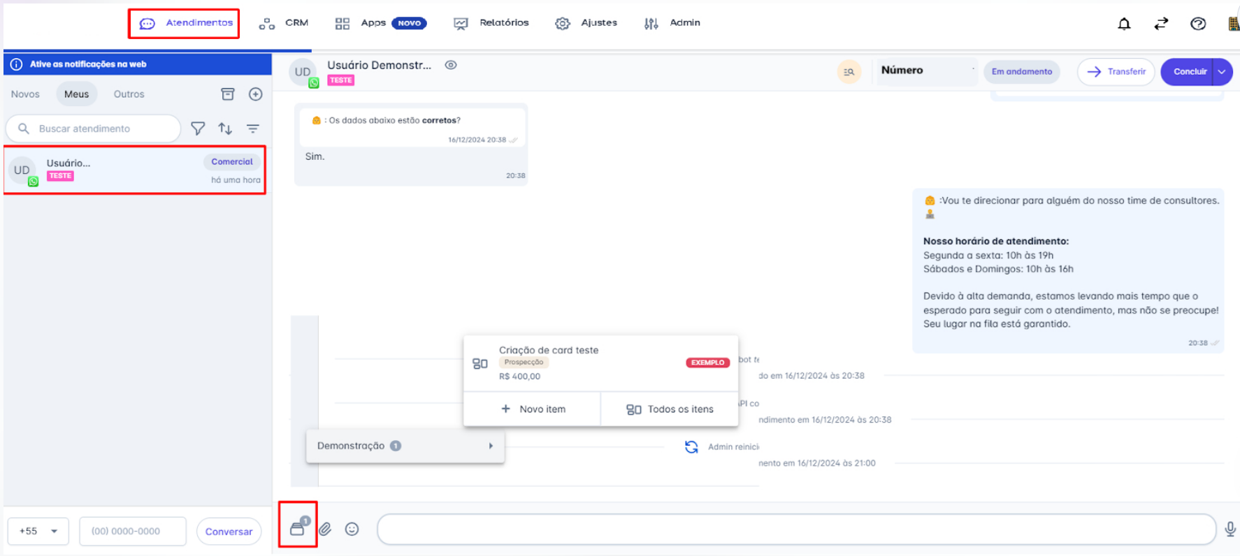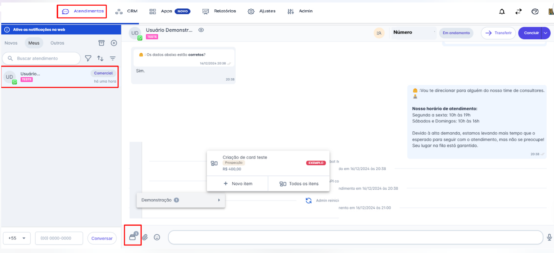 Passo 1: Na tela inicial, acesse o menu "Atendimentos". Selecione o contato para o qual deseja inserir um card em um painel, para que a janela de conversa seja aberta. Em seguida, clique no ícone corre