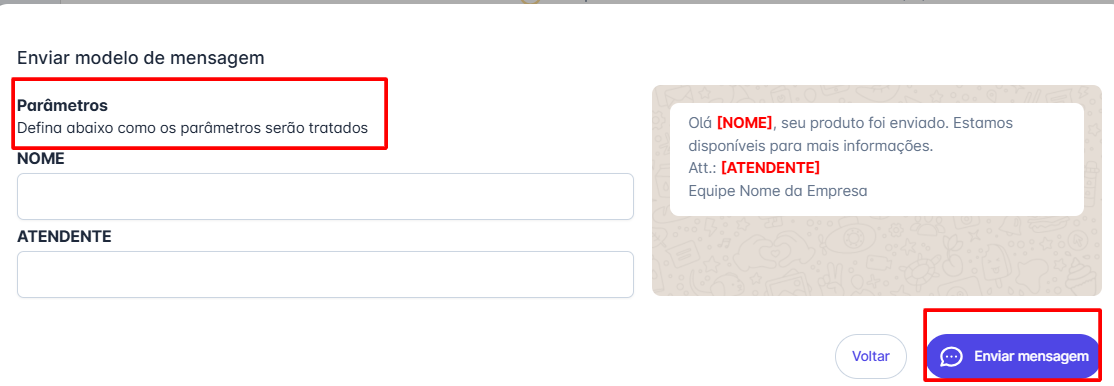 Passo 3: Preencha os parâmetros contidos na mensagem (caso seja necessário), em seguida clique em Enviar mensagem.