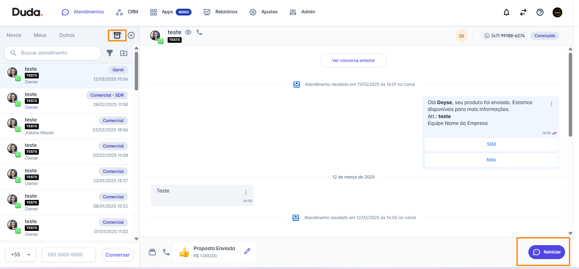 Passo 1: Na tela de atendimentos, selecione o contato que deseja reiniciar o atendimento. Isso pode incluir: