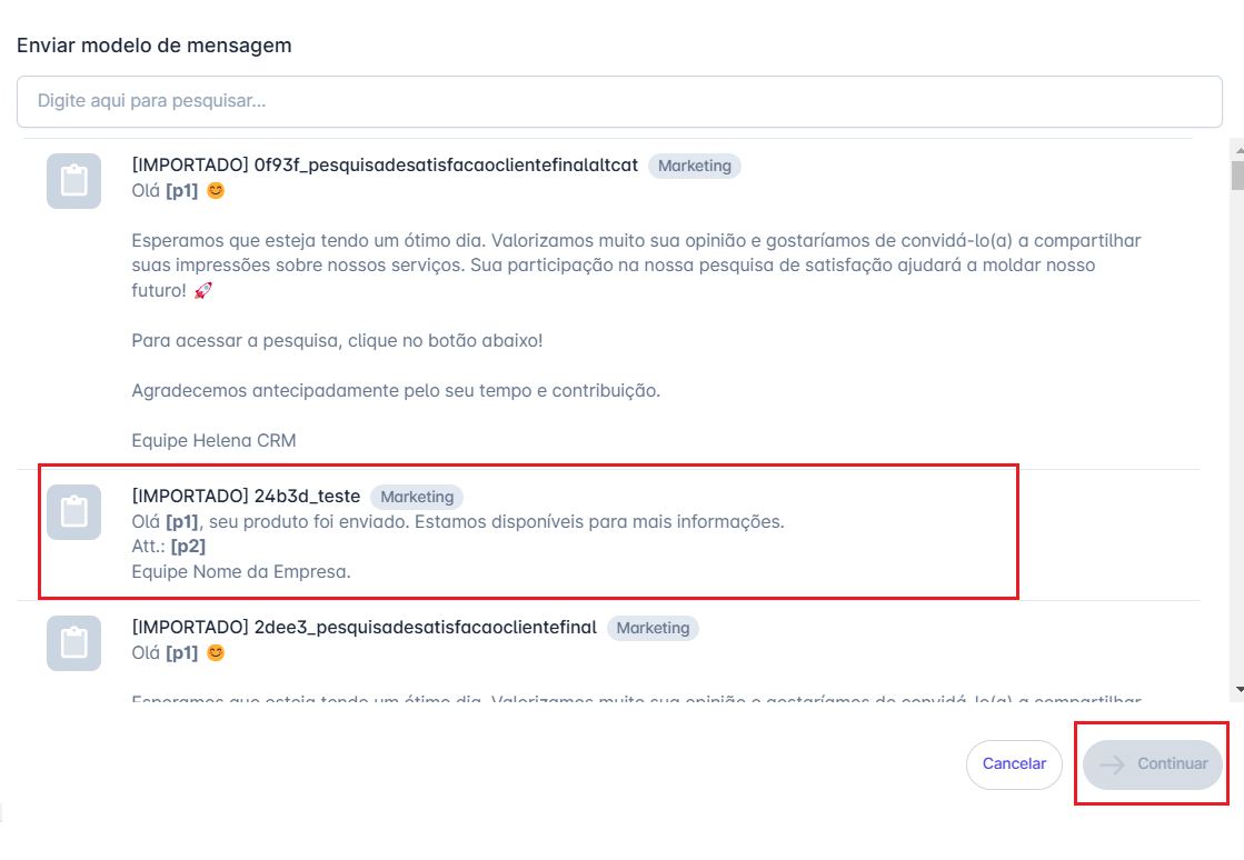 Passo 2: Ao clicar no botão reiniciar abrirá uma tela com a opção dos modelos de mensagens do tipo atendimento. Selecione o modelo que deseja utilizar para reiniciar seu atendimento em seguida clique em continuar.