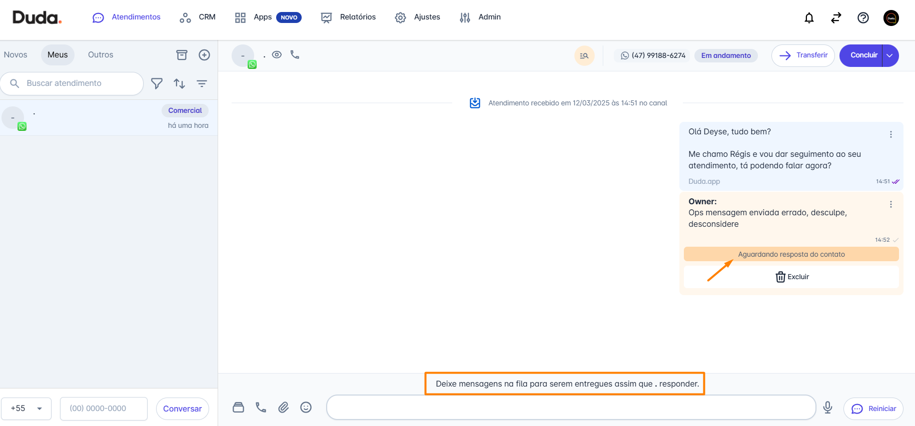 Passo 5: Se novas mensagens forem enviadas ao contato antes de qualquer interação da parte dele, essas mensagens permanecerão na fila, aguardando uma resposta do contato.