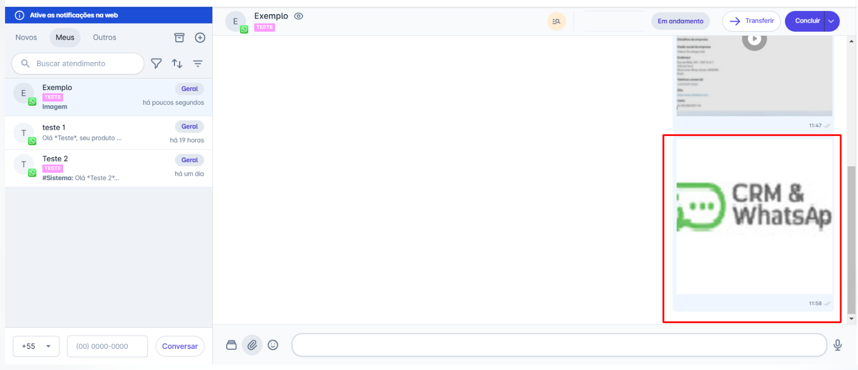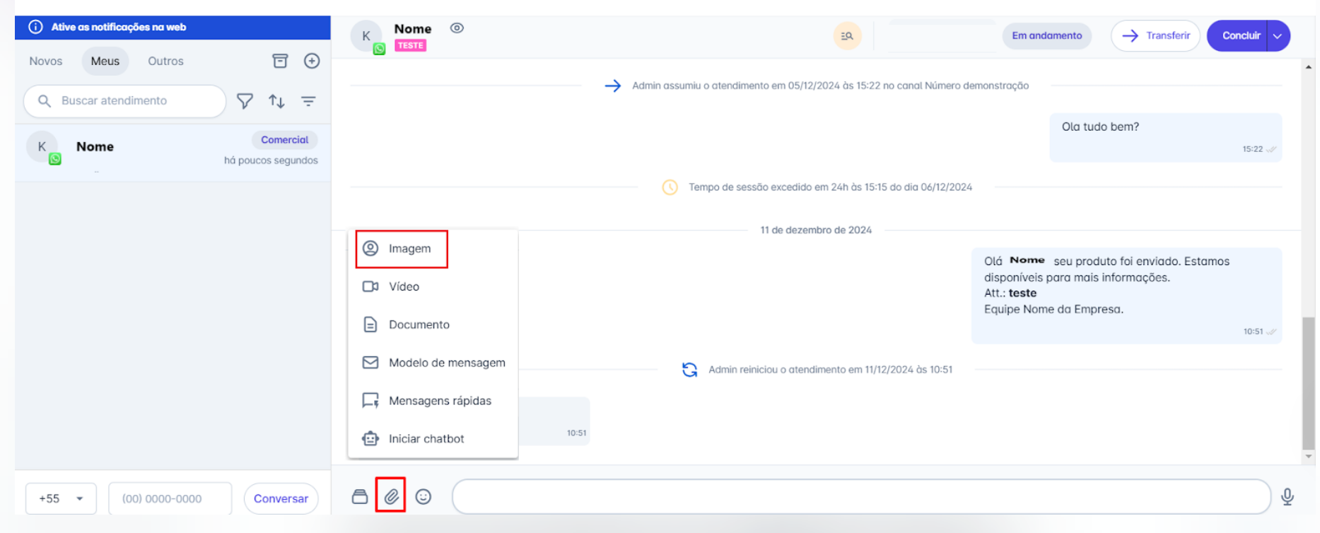 Passo 1: Na tela inicial, acesse o menu "Atendimentos". Selecione o contato para o qual deseja enviar a imagem, para abrir a janela de conversa. Em seguida, clique no ícone