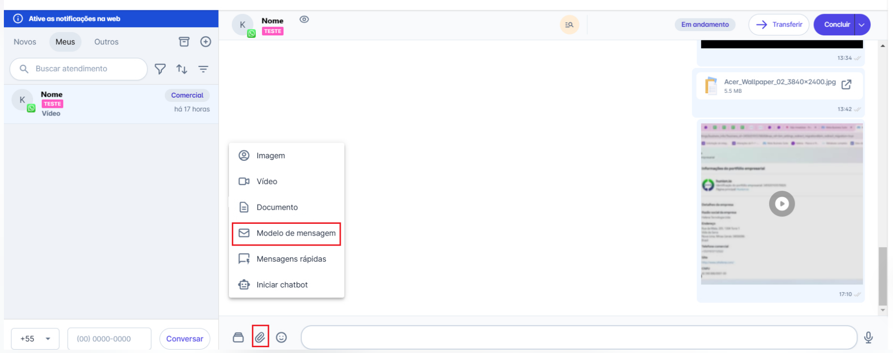 Passo 1: Na tela inicial, acesse o menu "Atendimentos". Selecione o contato para o qual deseja enviar um modelo de mensagem, para abrir a janela de conversa. Em seguida, clique no ícone