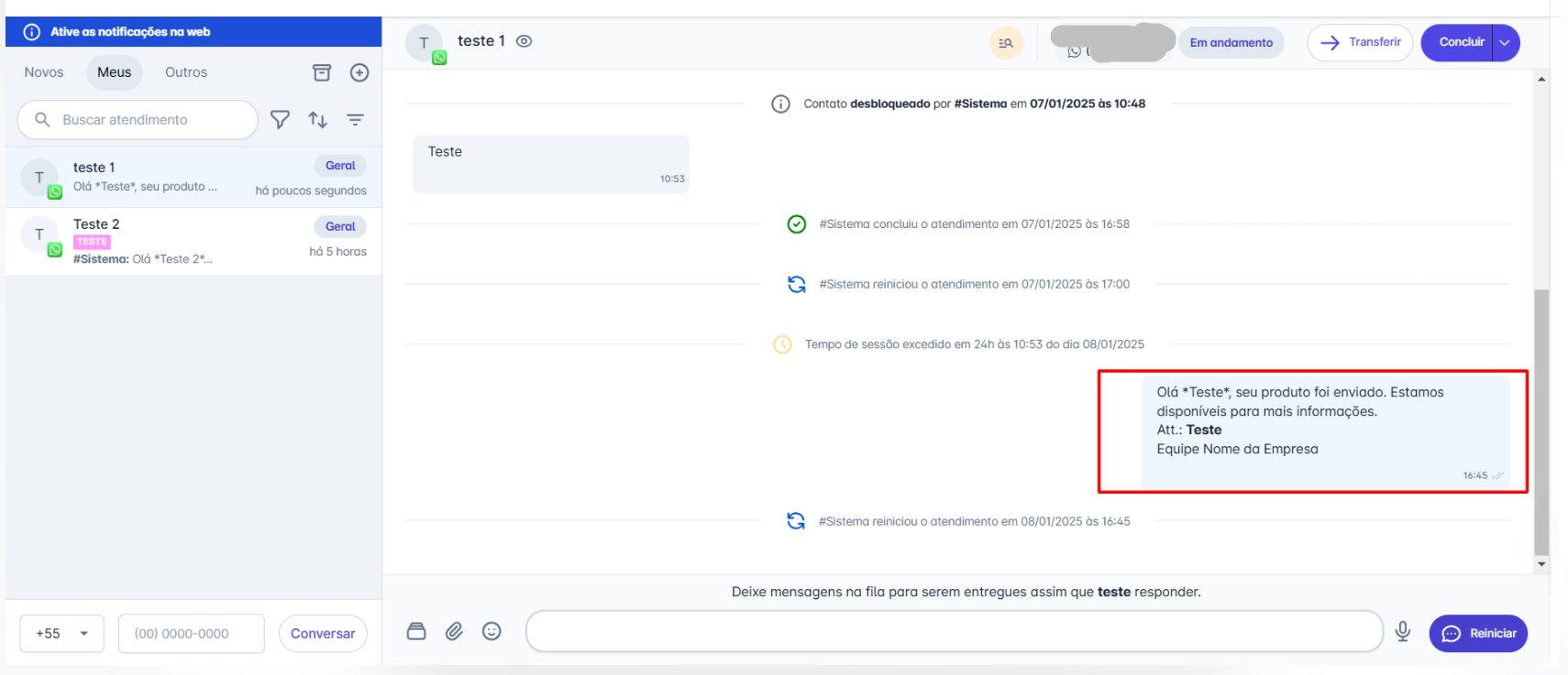 Passo 4: Após enviar o modelo de mensagem, ele será exibido na janela de conversa.