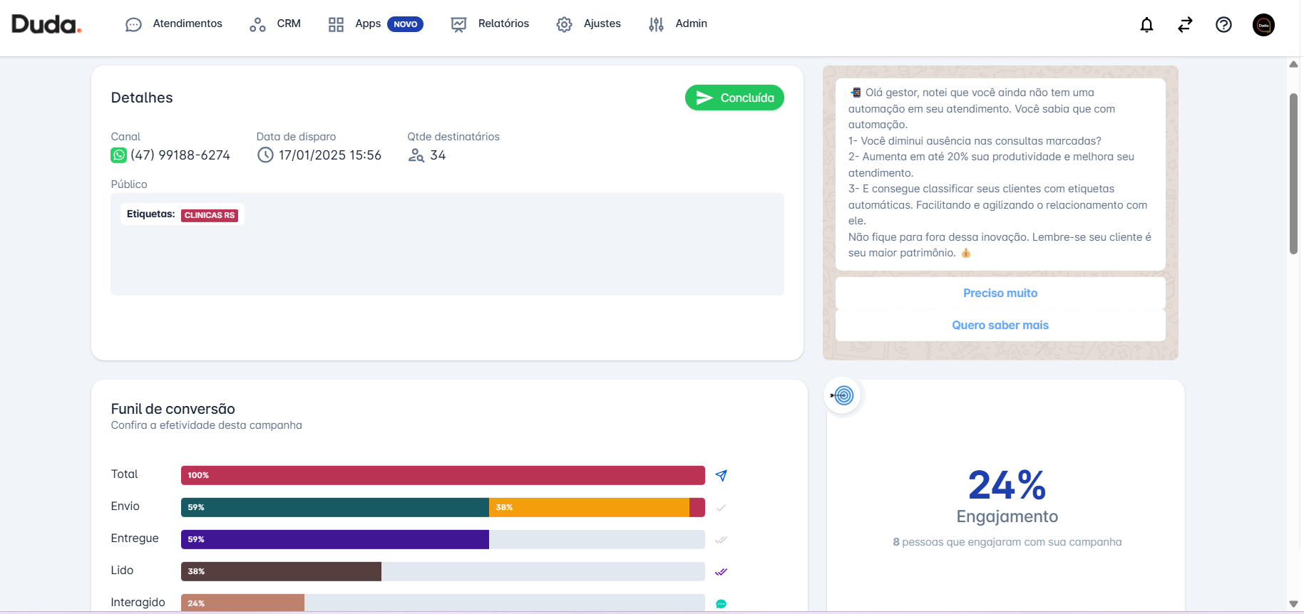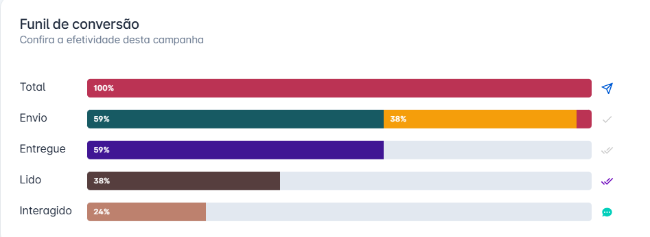 Acompanhe de forma gráfica a efetividade da campanha disparada, analisando parâmetros como: o número de pessoas para as quais a campanha foi enviada, a porcentagem de pessoas que leram a campanha e a quantidade de interações com a campanha, também expressa em porcentagem.