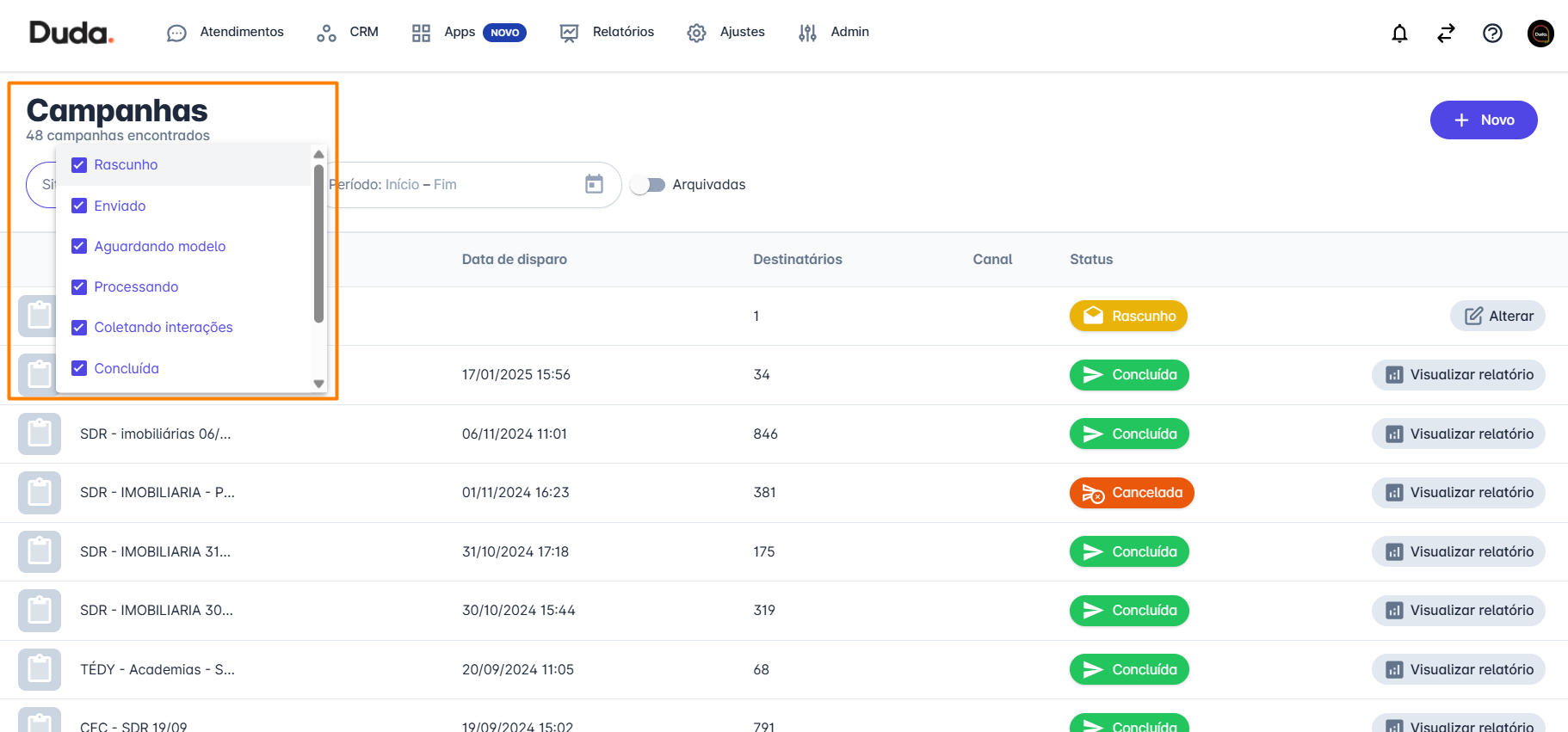 Passo 2: Localize a campanha que deseja consultar. Para isso, você pode utilizar os filtros disponíveis, como o filtro por período ou situação da campanha.