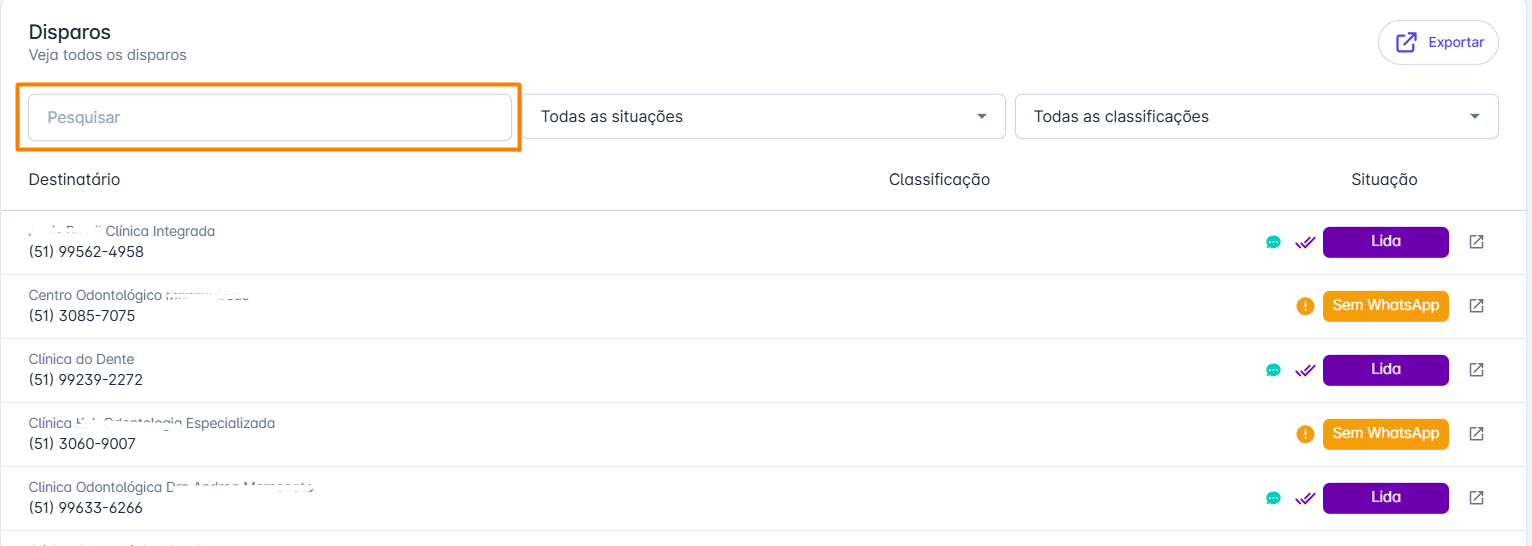 Acompanhe cada disparo de forma individualizada. Aplique filtros para buscar disparos com base na situação (Cancelada, Na Fila, Enviada, Entregue, Lida, Falha) ou pelo nome do contato, conforme mostrado na imagem abaixo.