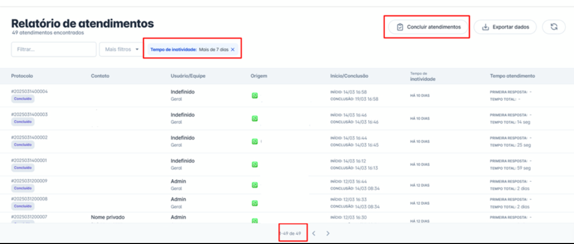 Utilize critérios como status, tipo de solicitação ou responsável para garantir que apenas os atendimentos corretos sejam finalizados.