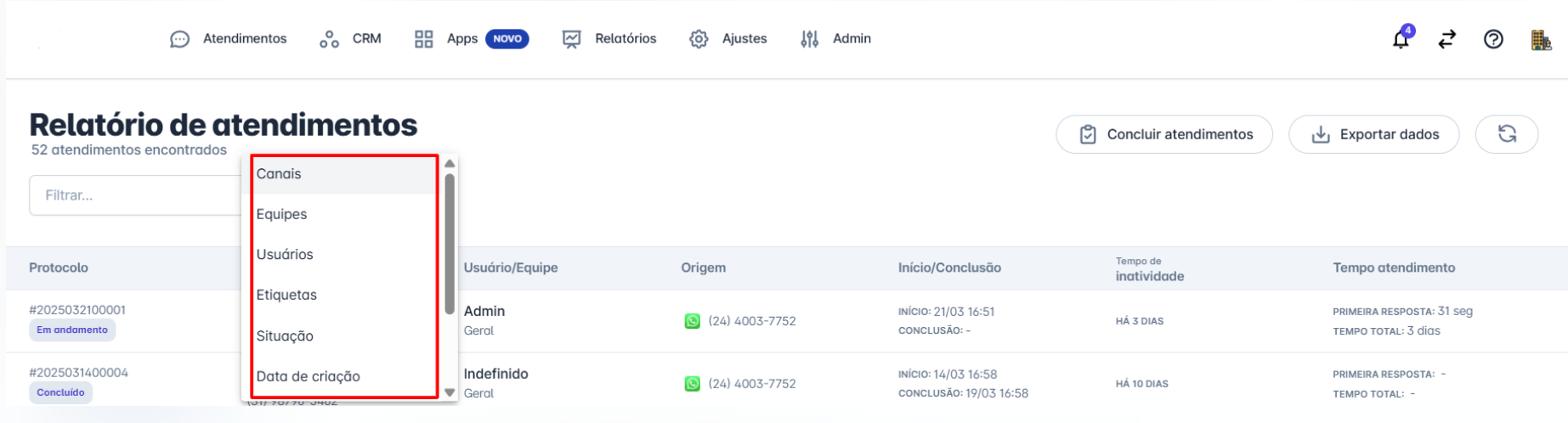Use filtros para segmentar os atendimentos